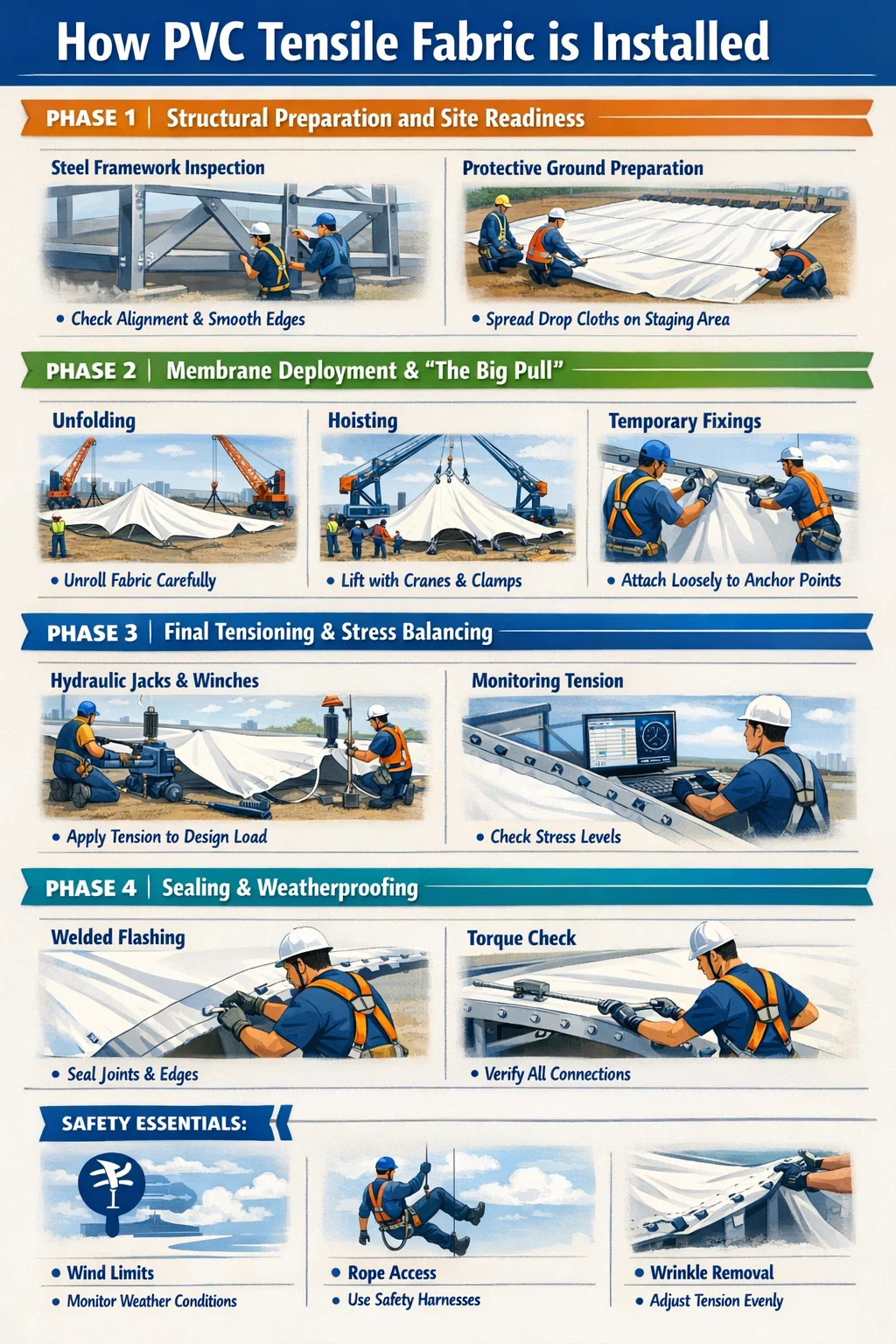 Installerer PVC-strekkstoff er en presisjonskonstruert prosess som forvandler en fleksibel membran til et stivt, strukturelt tak. I motsetning til tradisjonell taktekking er installasjonen avhengig av konstruert spenning heller enn masse. Prosessen begynner med montering av en primær støttestruktur av stål eller tømmer, etterfulgt av forsiktig utrulling av stoffet, festing til perimeterfester, og en systematisk "strekkfase" hvor materialet trekkes til sin beregnede designspenning for å sikre motstand mot vind- og snølast.