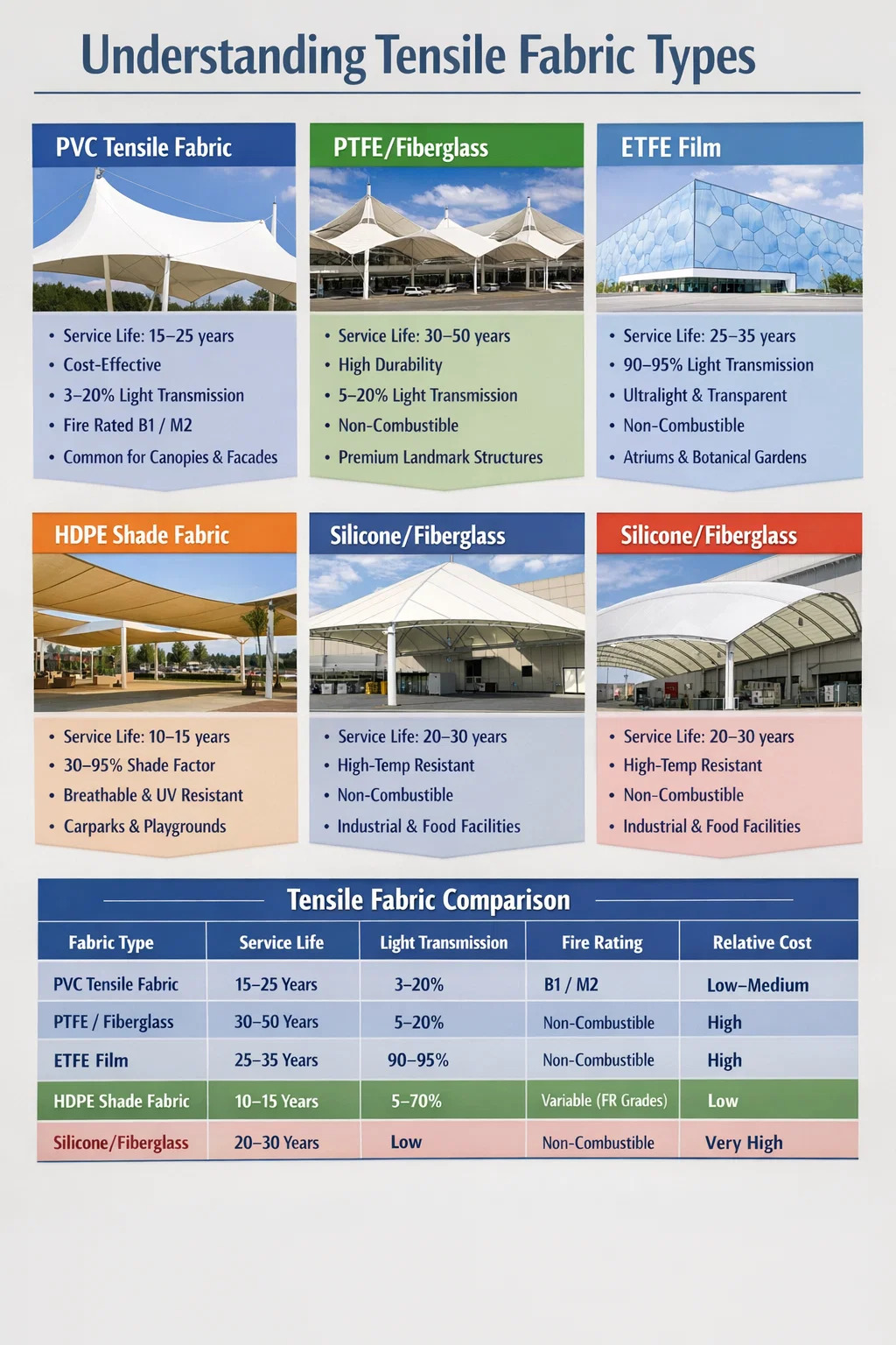 | PTFE/glassfiber | 30–50 år | 5–20 % | Ikke brennbart | Høy | Flyplasser, stadioner, landemerketak |