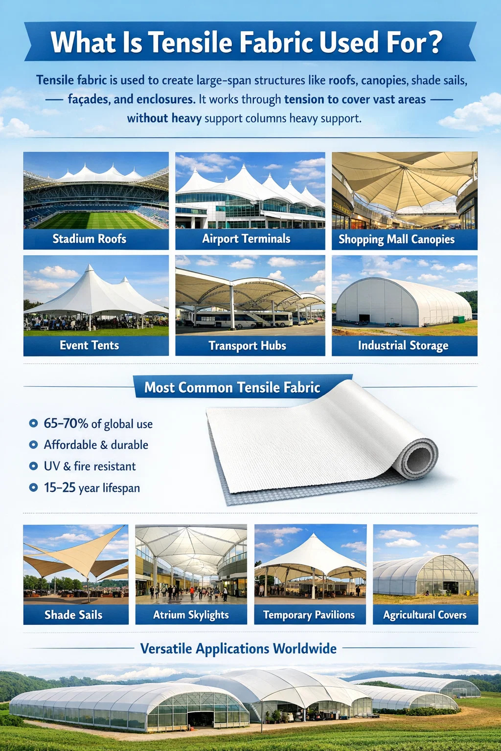 Strekkstoff brukes til å lage arkitektoniske strukturer med store spenn - tak, baldakiner, skyggeseil, fasader og innhegninger - som kombinerer strukturell styrke med lettvektsfleksibilitet. I motsetning til konvensjonelle stive takmaterialer, fungerer strekkstoff ved å fordele belastning gjennom strekk i stedet for kompresjon, noe som betyr at det kan dekke enorme områder uten tunge støttesøyler eller tykk innramming. I praksis vil du finne strekkstoff på sportsstadioner, flyplassterminaler, baldakiner i kjøpesenter, utendørs arrangementssteder, parkeringsplasser, fornøyelsesparker og til og med broganger rundt om i verden.